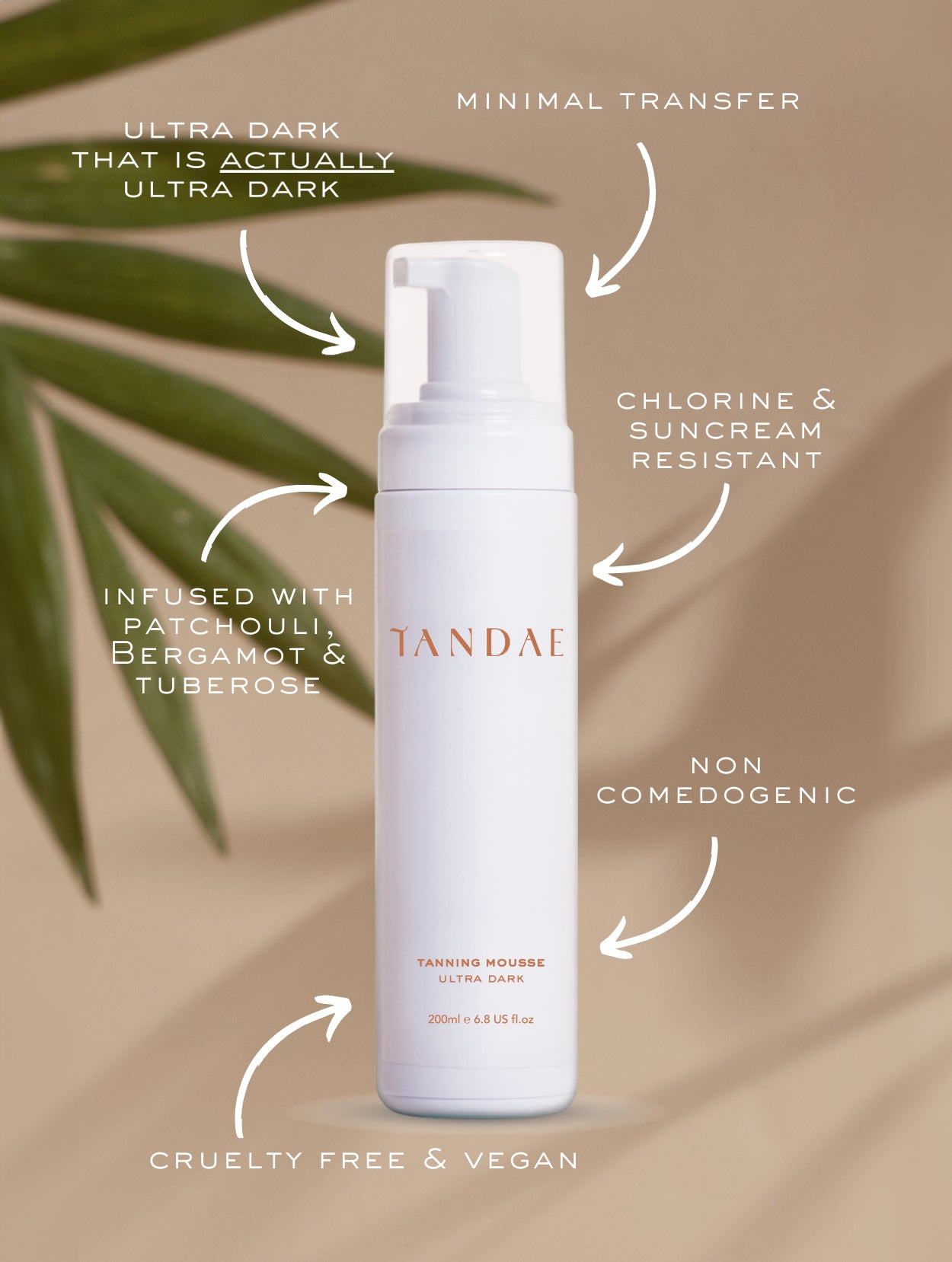 Tandae is a specially formulated tanning mousse to not only bronze, but airbrush your skin to perfection. Our mousse gives a natural, streak-free and flawless tan which stays looking fresher for longer and fades subtly.