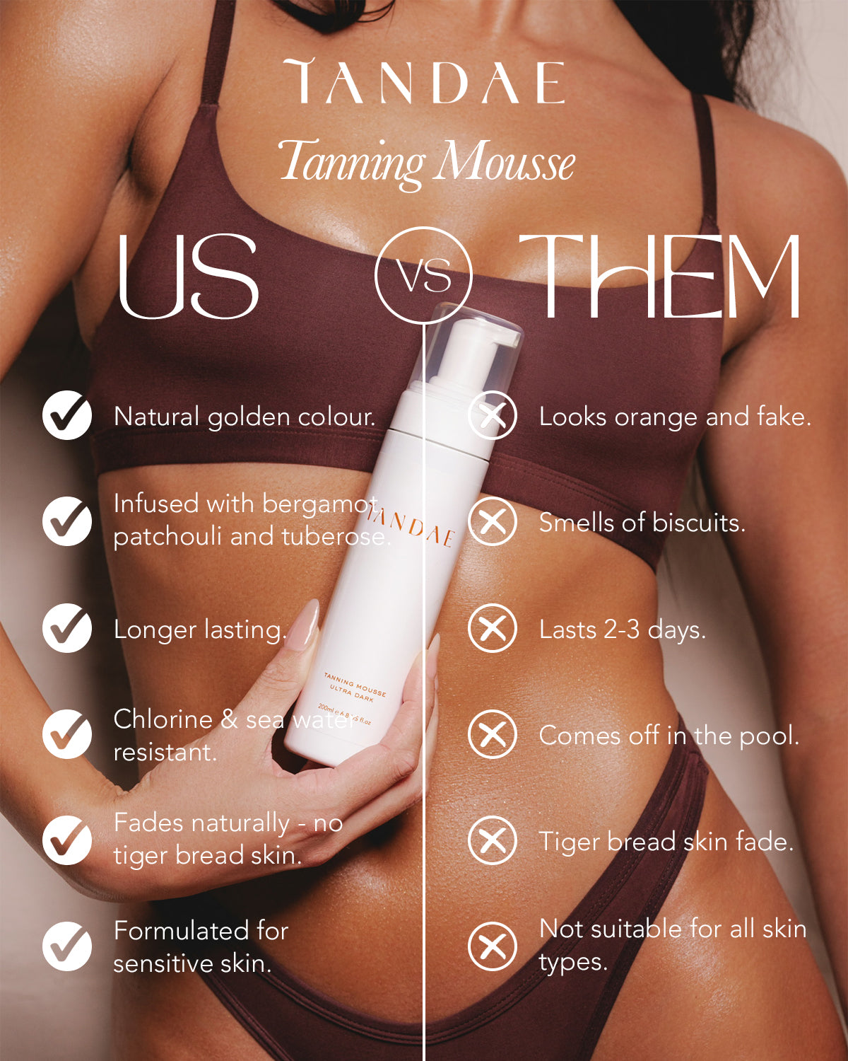 Tandae is a specially formulated tanning mousse to not only bronze, but airbrush your skin to perfection. Our mousse gives a natural, streak-free and flawless tan which stays looking fresher for longer and fades subtly.